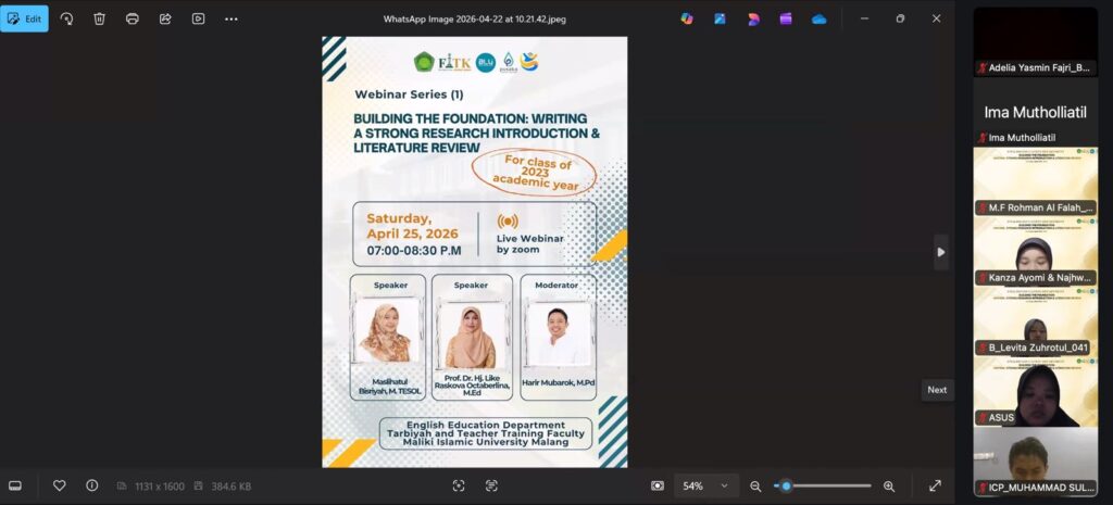 Malang (27/04/2026) – Program Studi Tadris Bahasa Inggris sukses menyelenggarakan Webinar Series 1 pada Sabtu, 25 April 2026, pukul 19.00–20.30 WIB secara daring. Kegiatan ini mengusung tema “Building the Foundation: Writing a Strong Research Introduction & Literature Review” yang bertujuan membekali mahasiswa dengan pemahaman dasar yang kuat dalam penulisan skripsi, khususnya pada bagian pendahuluan dan […]